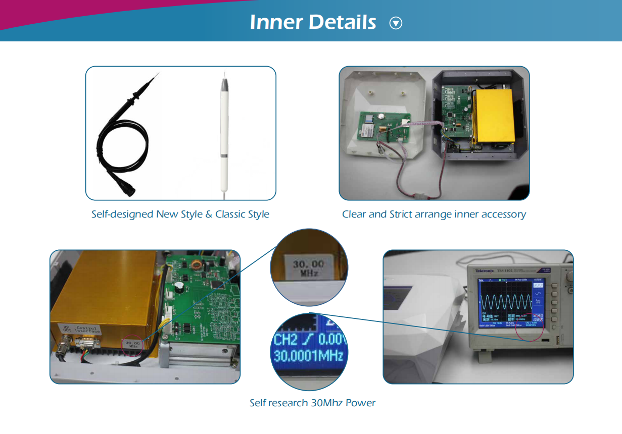 This instrument will produce 30000000 Hz ultra high frequencyelectro magnetic oscillation with the unique soft silk (than hair thinner) to breakdown the hemoglobin and release the energy transferring into the skin surface to remove lesions, capillaries, and intravascular hemoglobin and break them into small molecules that will be absorbed by tissues, and disappeared with body's metabolism.